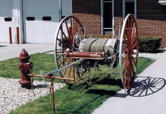 In September of 1899, the Village of Manhattan purchased two #6 hose carts, 650 feet of safety hose, two play pipe nozzles, and other equipment from the New York Belting Company for 450 dollars. When the village started installing water mains in the 1890s, it was then possible to have pressurized water available for firefighting, which could be applied through the hose and nozzles carried on the hose carts, rather than just throwing the water on the fire with the buckets that had been stationed throughout the town at horse troughs and cisterns.