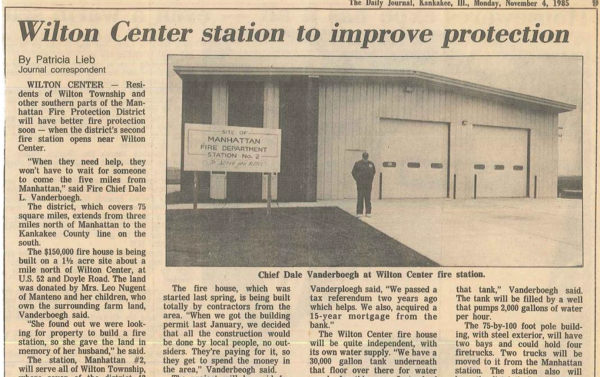 1950: Wilton Township voted to be in the district, starting the Manhattan Fire Protection District, approx. 72 sq. miles
